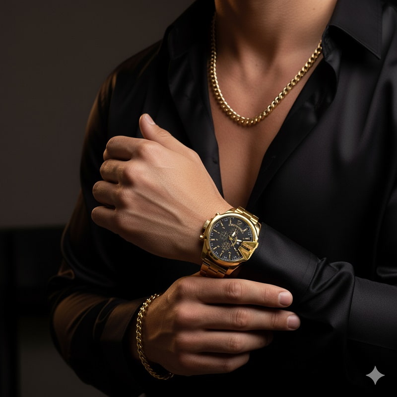 ست ساعت مچی مردانه طلایی صفحه مشکی مدل U700 + دستبند و گردنبند کارتیه رنگ طلایی