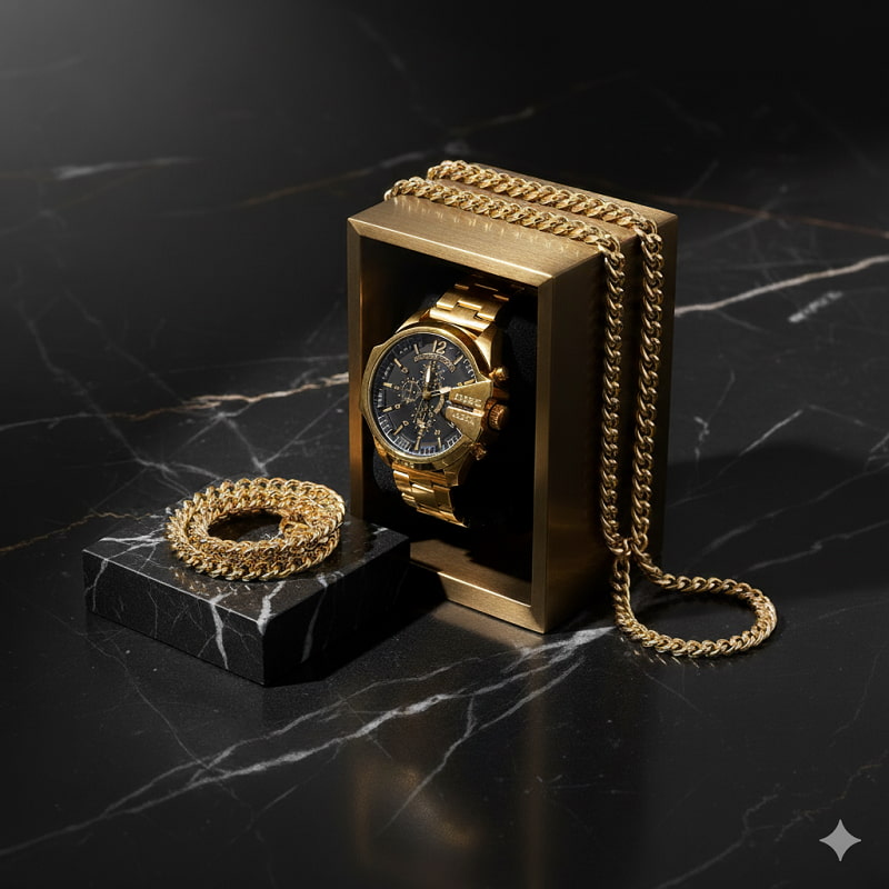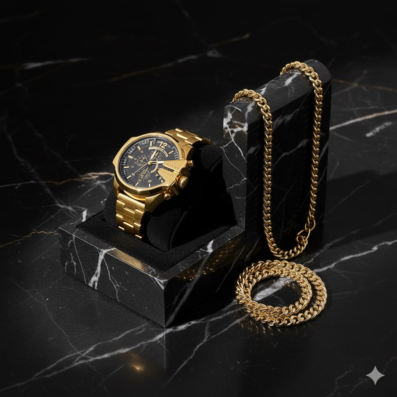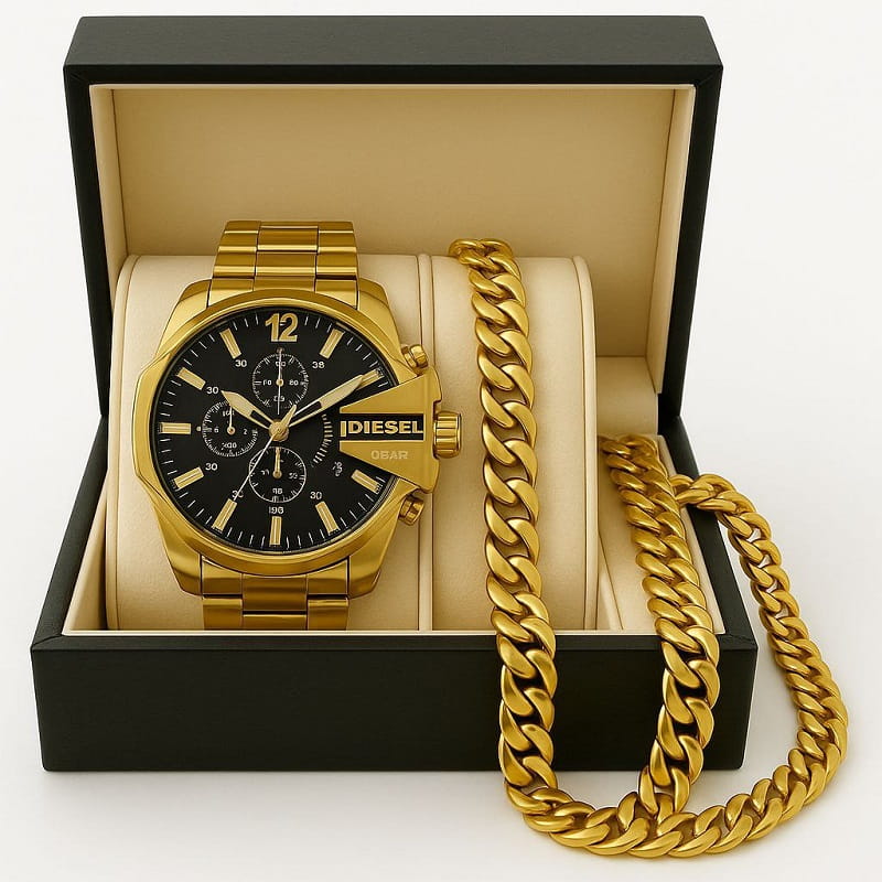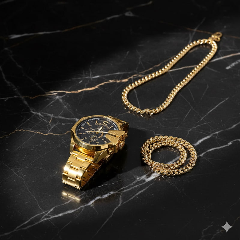 ست ساعت مچی مردانه طلایی صفحه مشکی مدل U700 دستبند و گردنبند کارتیه رنگ طلایی