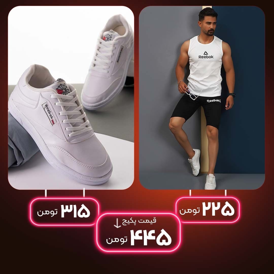 پکیج کفش ورزشی Reebok مردانه سفید مدل Flagست رکابی شلوارک Reebok مردانه مدل Arta