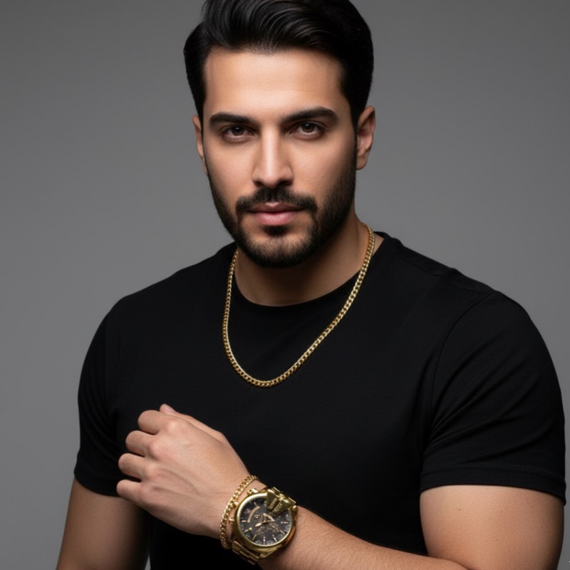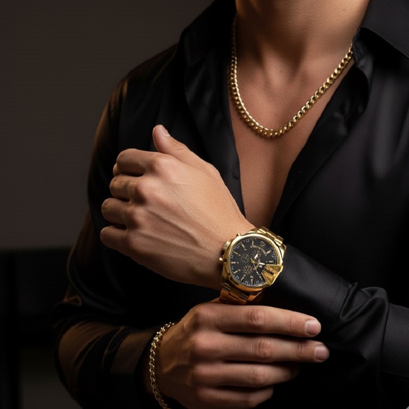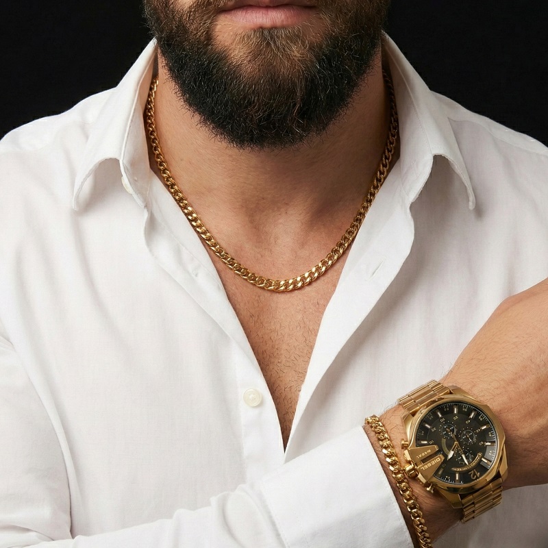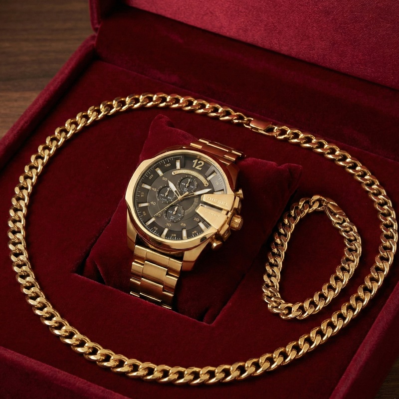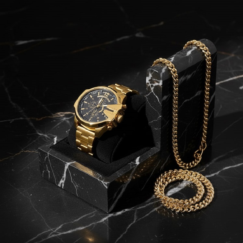 ست ساعت مچی مردانه طلایی صفحه مشکی مدل U700 دستبند و گردنبند کارتیه رنگ طلایی