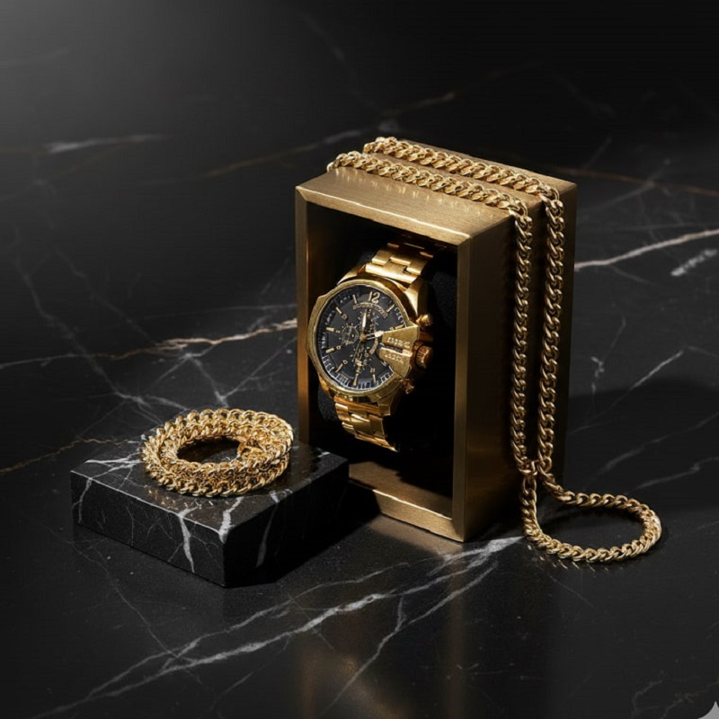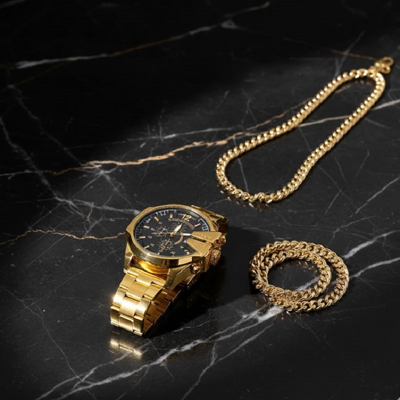 ست ساعت مچی مردانه طلایی صفحه مشکی مدل U700 + دستبند و گردنبند کارتیه رنگ طلایی