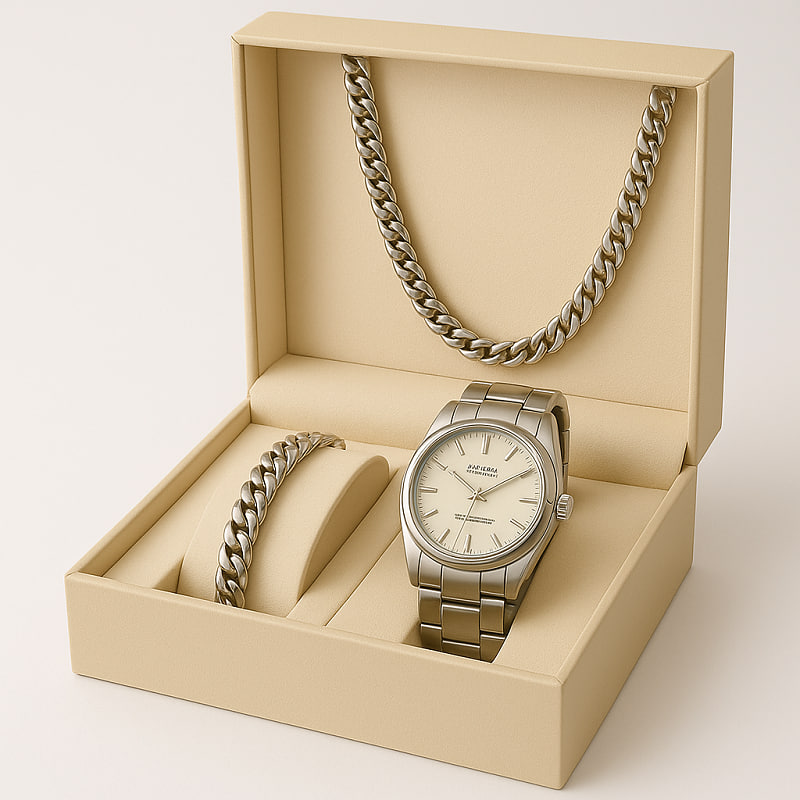 پیکج نیم ست نقره ای Cartier ساعت رولکس نقره ای صفحه مشکی مدل Oyster