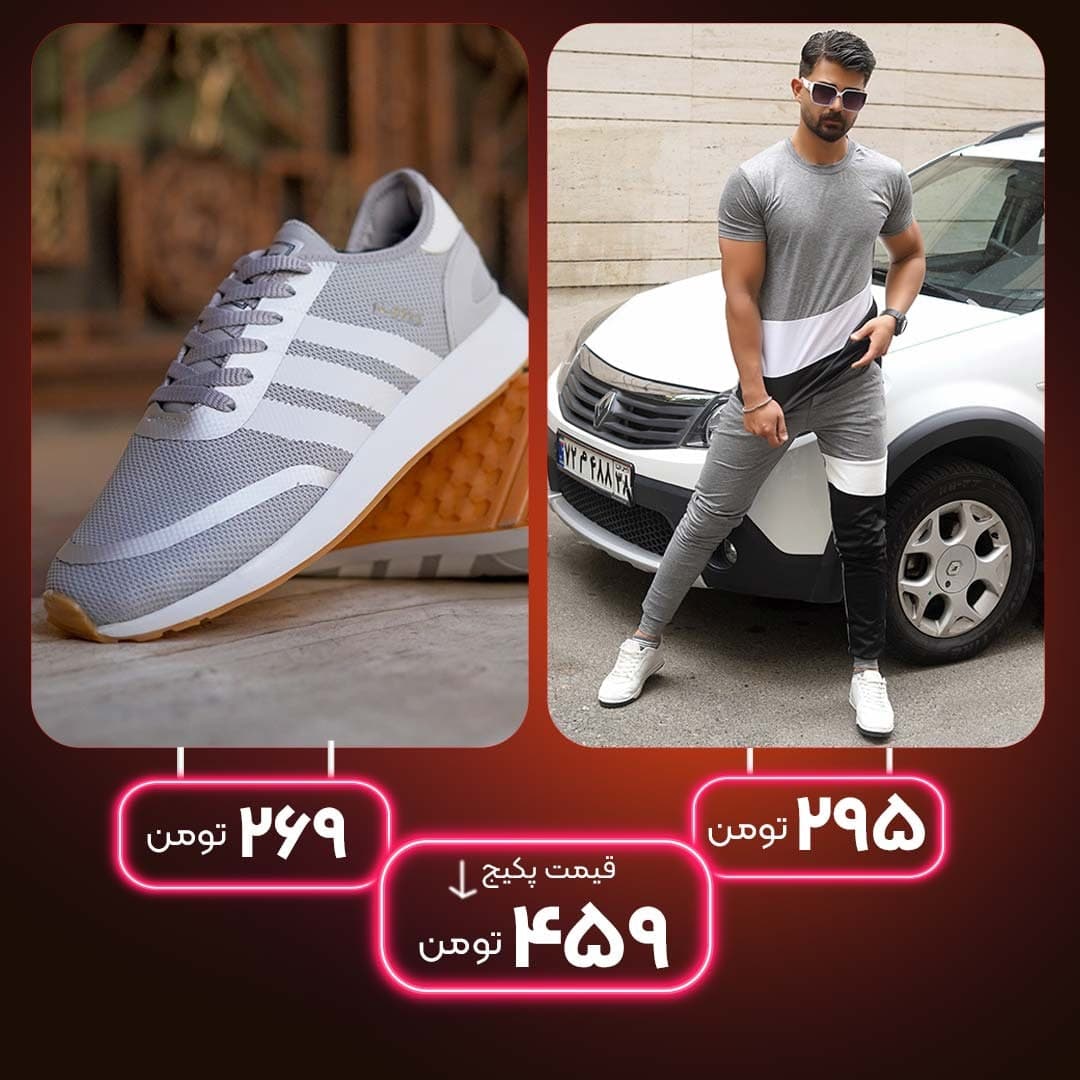 پکیج کفش مردانه طوسی سفید مدل N-5923ست تیشرت شلوار مردانه مدل Radon