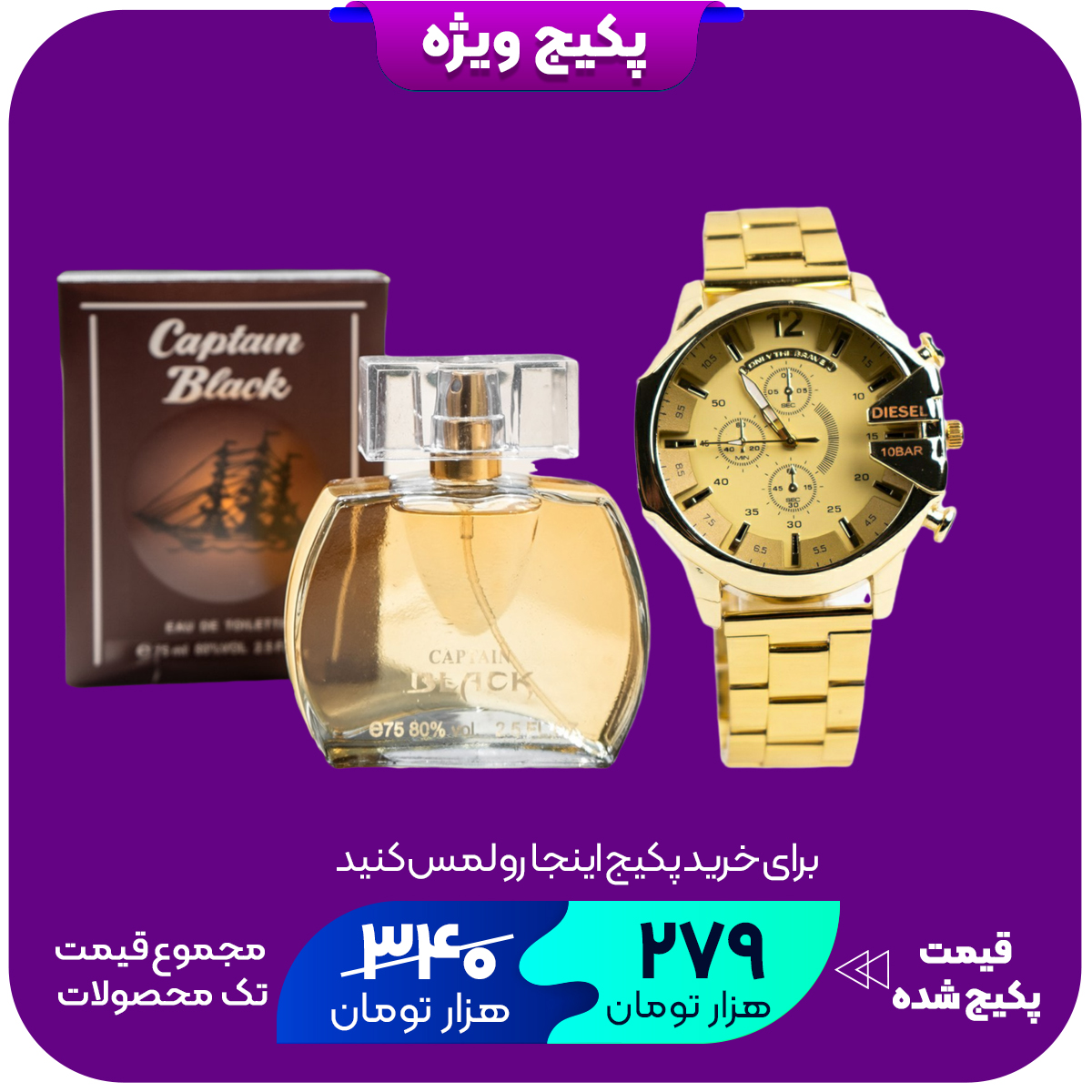 پکیج ساعت مچی DIESEL مردانه طلایی صفحه طلایی مدل U700 عطر مردانه Captain Black